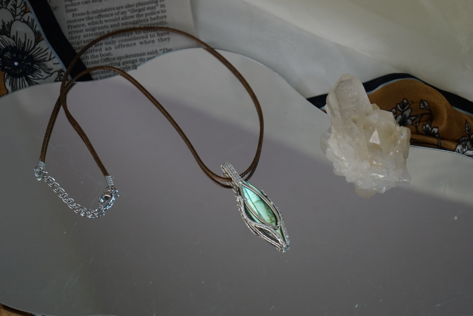 This handcrafted pendant features a mesmerizing marquise-shaped labradorite stone, known for its magical iridescent glow. Wrapped in white copper wire, each curve and twist is carefully shaped to cradle the stone like a secret from the forest.